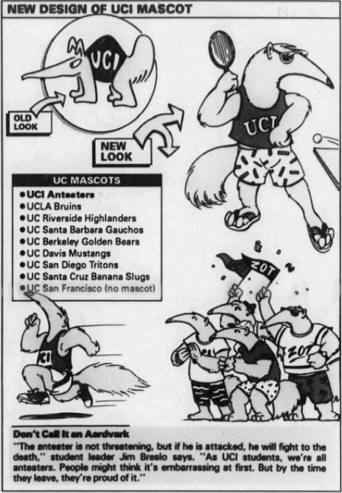 The following was published in the Los Angeles Times, when the Anteater was redesigned to be standing up on two feet like a human, wearing shorts and shoes, and looking athletic. "Peter no longer spends all his time on all fours like a dog," reported the Los Angeles Times. "Gone are the talons, the oversized ears and the humpback."