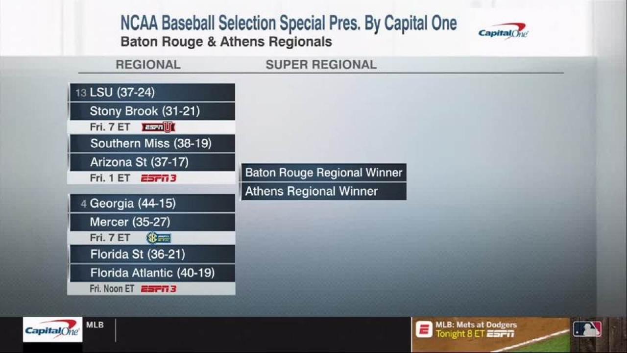 The remaining at-large teams, top-16 national seeds, first-round regional pairings and site assignments will be announced at noon (ET), Monday, May 27. The one-hour program will be shown live on ESPNU. The committee will set the entire 64-team bracket through both the super regionals and the first round of the Men’s College World Series and will not reseed the field after play begins.
