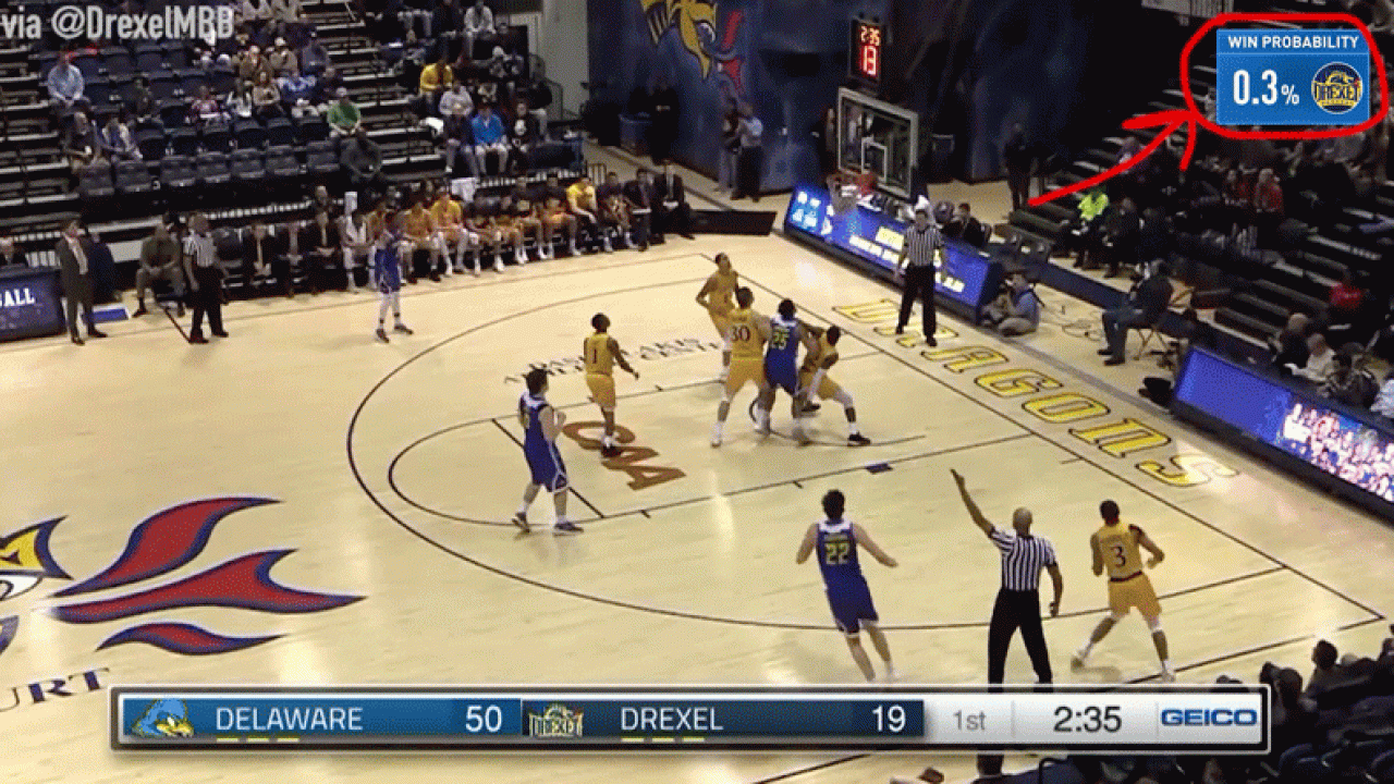 Largest deficit overcome to win — Drexel vs. Delaware on Feb. 22, 2018 (34 points)