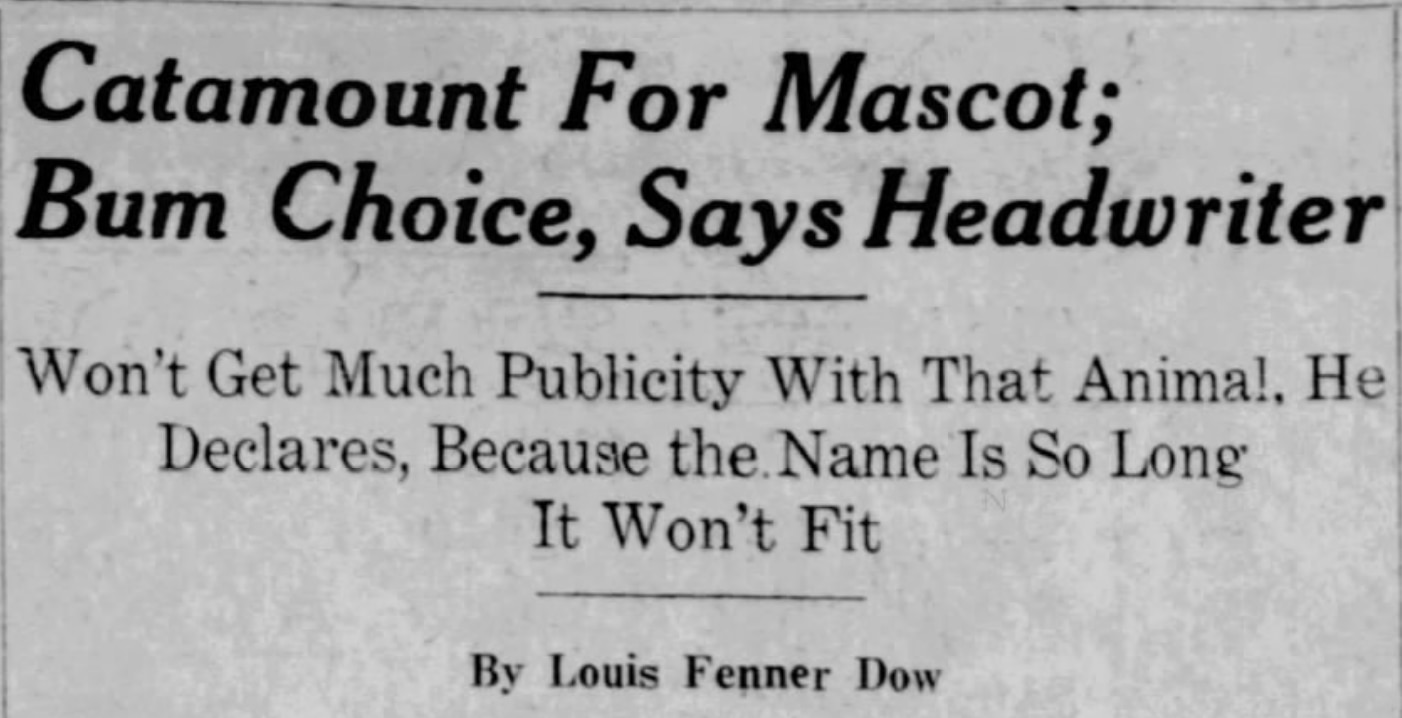 "When all the headwriters start trying to get 'catamount' or 'Vermont catamount' into one line of a head they'll get so blamed mad when they find it won't fit that they'll throw the publicity in the basket," wrote the Burlington Daily News' Louis Fenner Dow, reciting a conversation he had with another newspaper writer.