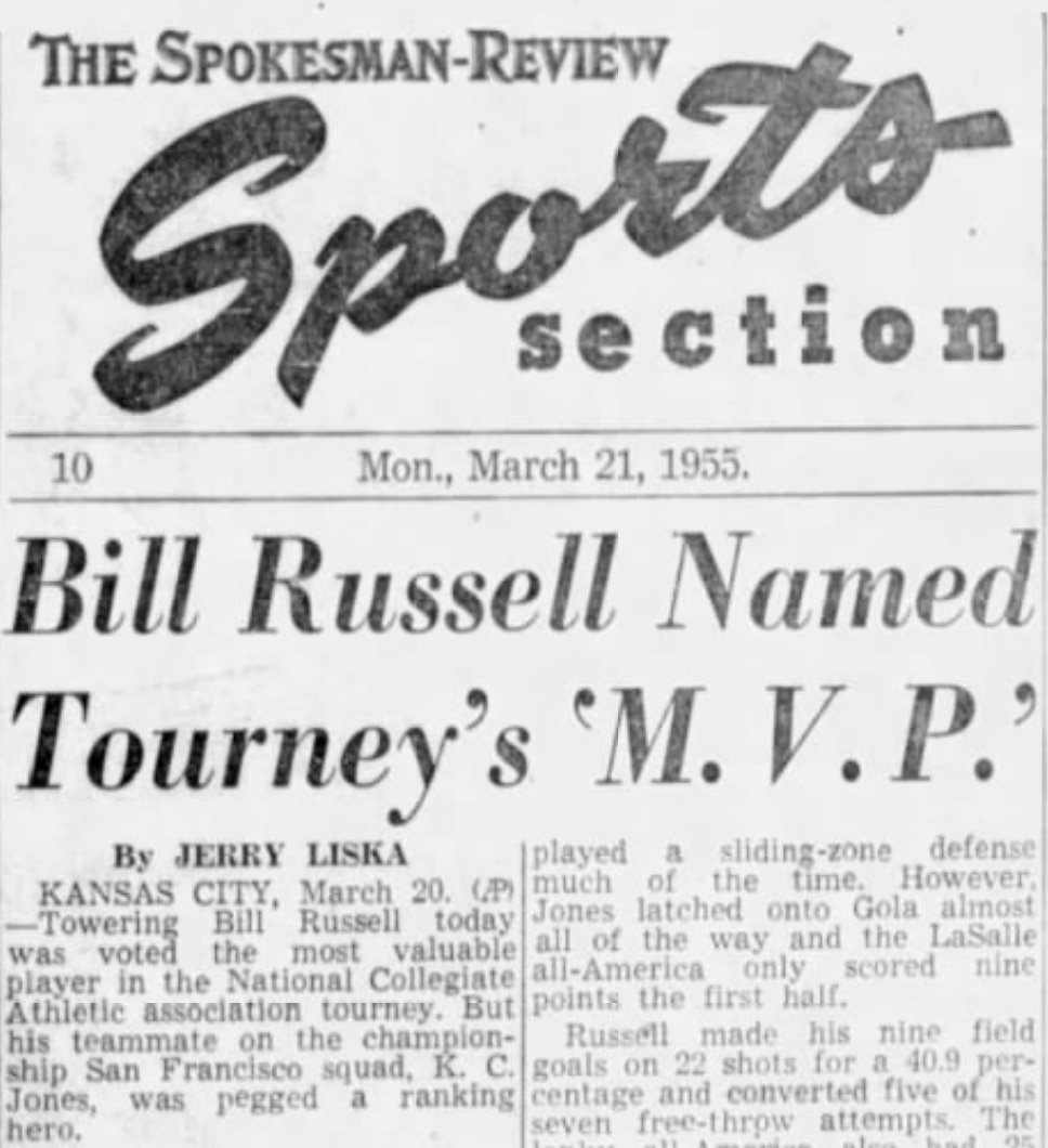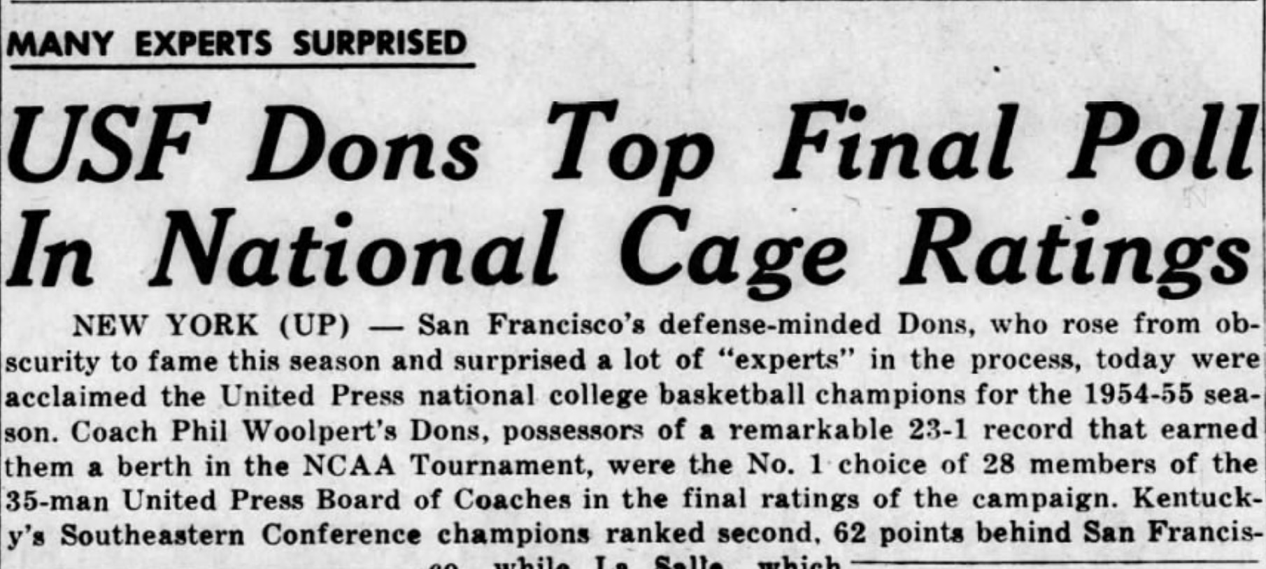 "The West Coast Dons' prospects were regarded so lightly before the start of the campaign that not a single coach mentioned them in the pre-season sizeup of the race," reported the United Press. "But (Phil) Woolpert's men, led by All-America center Bill Russell, fooled a host of basketball authorities."