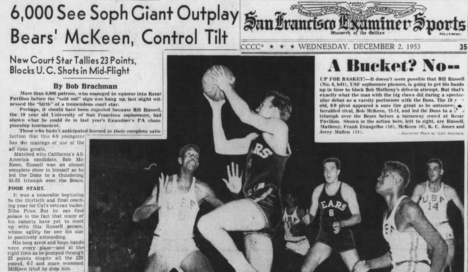 After covering San Francisco's season-opening 51-33 win over Cal in the 1953-54 season, the Oakland Tribune's Bill Dunbar wrote that Russell's "defensive play left Cal Center Bob McKeen so frustrated that the lanky Cal man had his best look at the basket from the bench," noting that Russell blocked layups that "looked like cinches for McKeen." The San Francisco Examiner reported that Russell had 13 blocks in the game, most of which he grabbed and started the fast break for the Dons. McKeen was an All-American; Russell was the game's high-scorer with 23 points.
