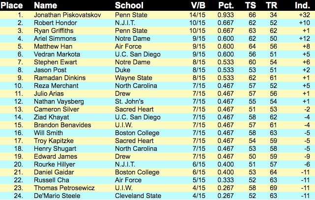 | 2001 | St. John's (N.Y.) | Yury Gelman | 180 | Penn State | 172 | Wisconsin-Parkside |