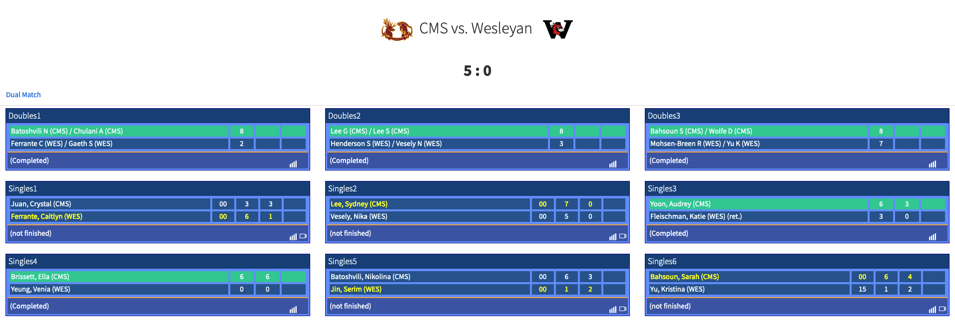 - Singles #2: Chicago’s Shianna Guo vs. Claremont-M-S Sydney Lee - DNF
