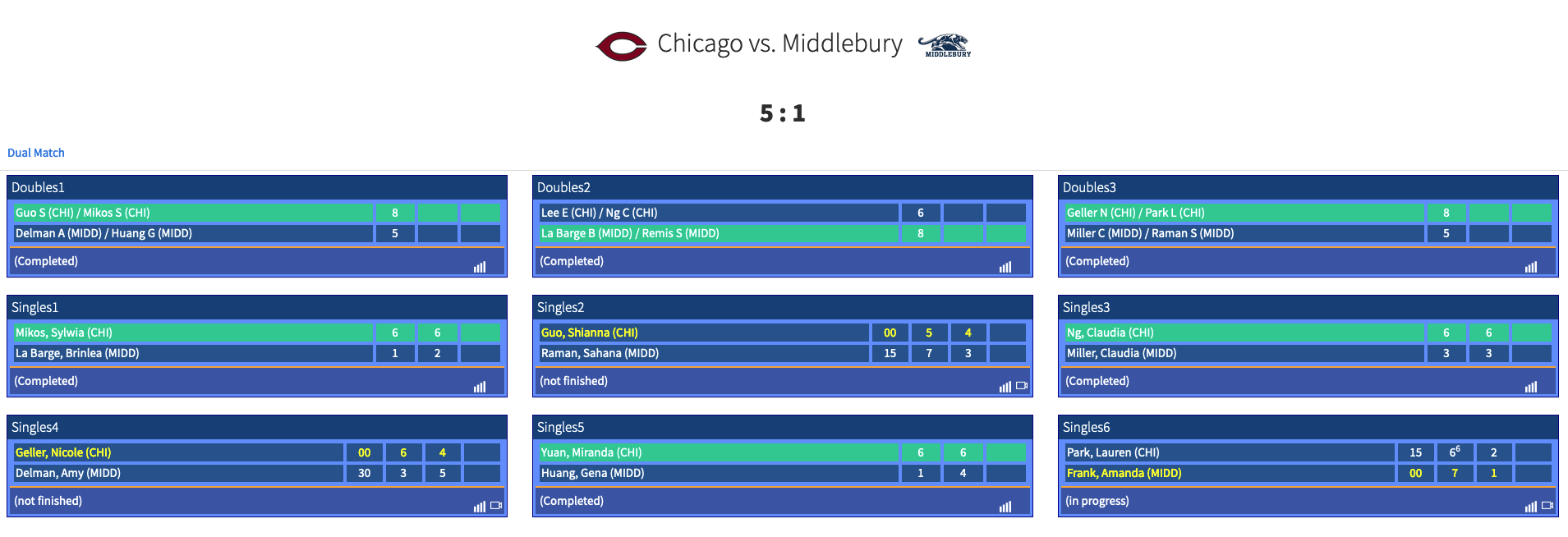- Doubles #2: Chicago’s Eugenia/Claudia Ng def. Claremont-M-S Gabby Lee/Sydney Lee, 8-3