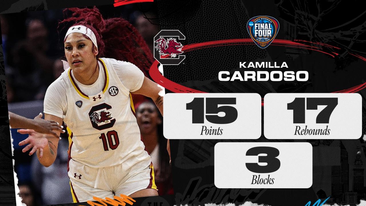 Throughout the tournament, Kamills Cardoso showcased her dominance by averaging 16.6 points, 10.8 rebounds, and 1.6 blocks per game. In the championship game against Iowa, she delivered 15 points and a career-high 17 rebounds, completing South Carolina's perfect season.