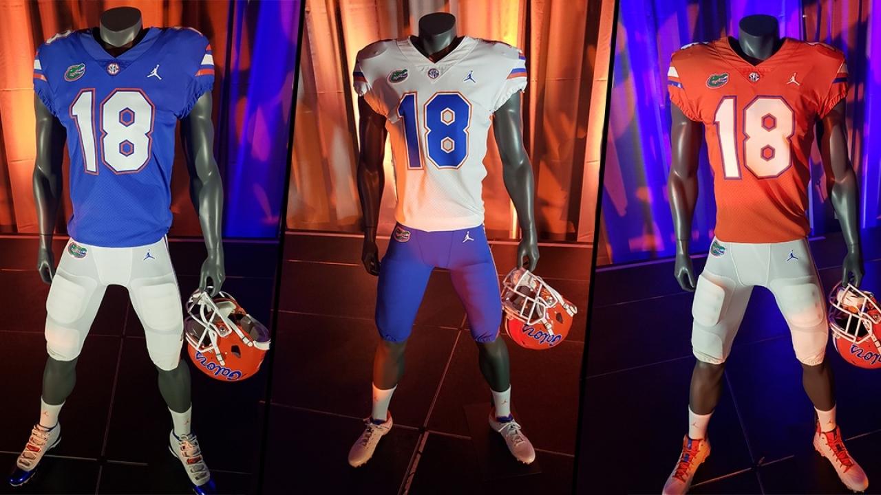 Three new kits were displayed during a Florida rally that was open to fans and media at Atlanta's World Congress Center Tuesday night β€” home blues, away whites and orange alternates. The Gators became the fourth college football program to switch over to Jordan Brand, and the partnership will extend toward the school's men's and women's basketball programs as well.