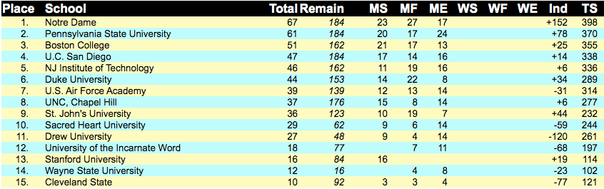 | 2016 | Columbia | Michael Aufrichtig | 174 | Ohio State | 167 | Brandeis |