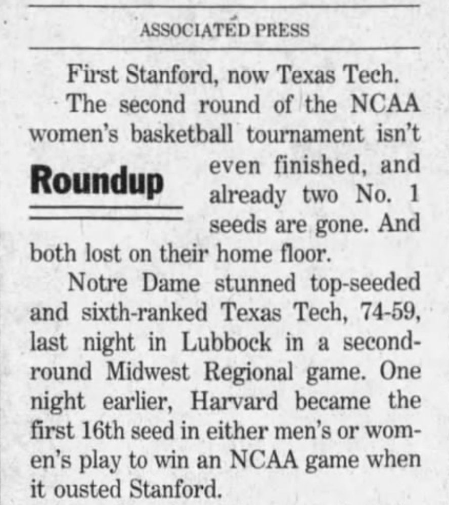 The record book shows that Harvard shocked the basketball world that day. The 71-67 victory over Stanford was the first time a No. 16 seed had ever beaten a No. 1 seed in either the women’s or men’s tournament. More than two decades later, only the UMBC men of 2018 have matched the feat when they stunned Virginia. That makes the current overall all-gender record of No. 1s in the matchup 250-2 (through the 2021 tournaments). Those were the enormously long odds the Crimson women overturned that day.